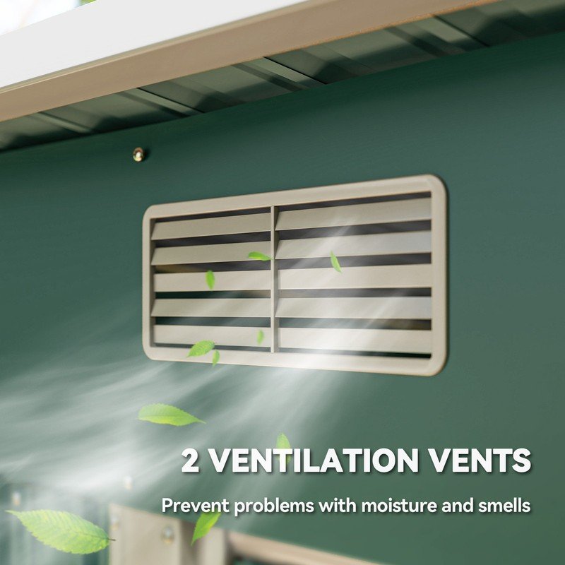 • Air vents: Two top front slots to keep metal shed inner as fresh as possible, helping to reduce mould and mildew build-up. Sloped roof to prevent rainwater build-up.
