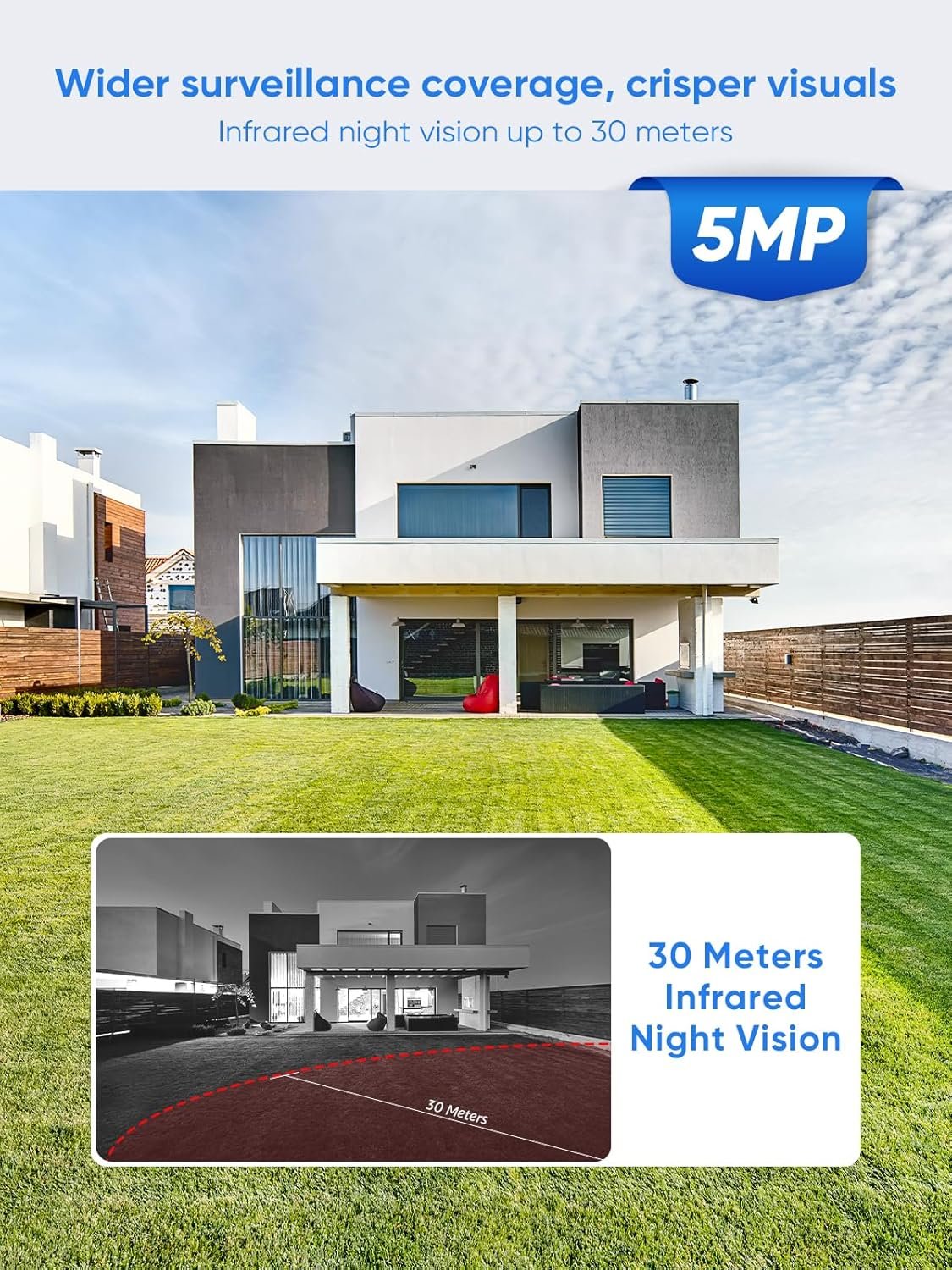 • 【2K & 100 ft Night Vision】 The wireless outdoor camera delivers true 2K 3MP Super HD footages, 1.5X pixels than 1080p cameras. Class-A infrared LEDs offer a night vision range of up to 100 ft (30 m). Digital WDR & DNR ensure the IR light won’t overexpose the objects.