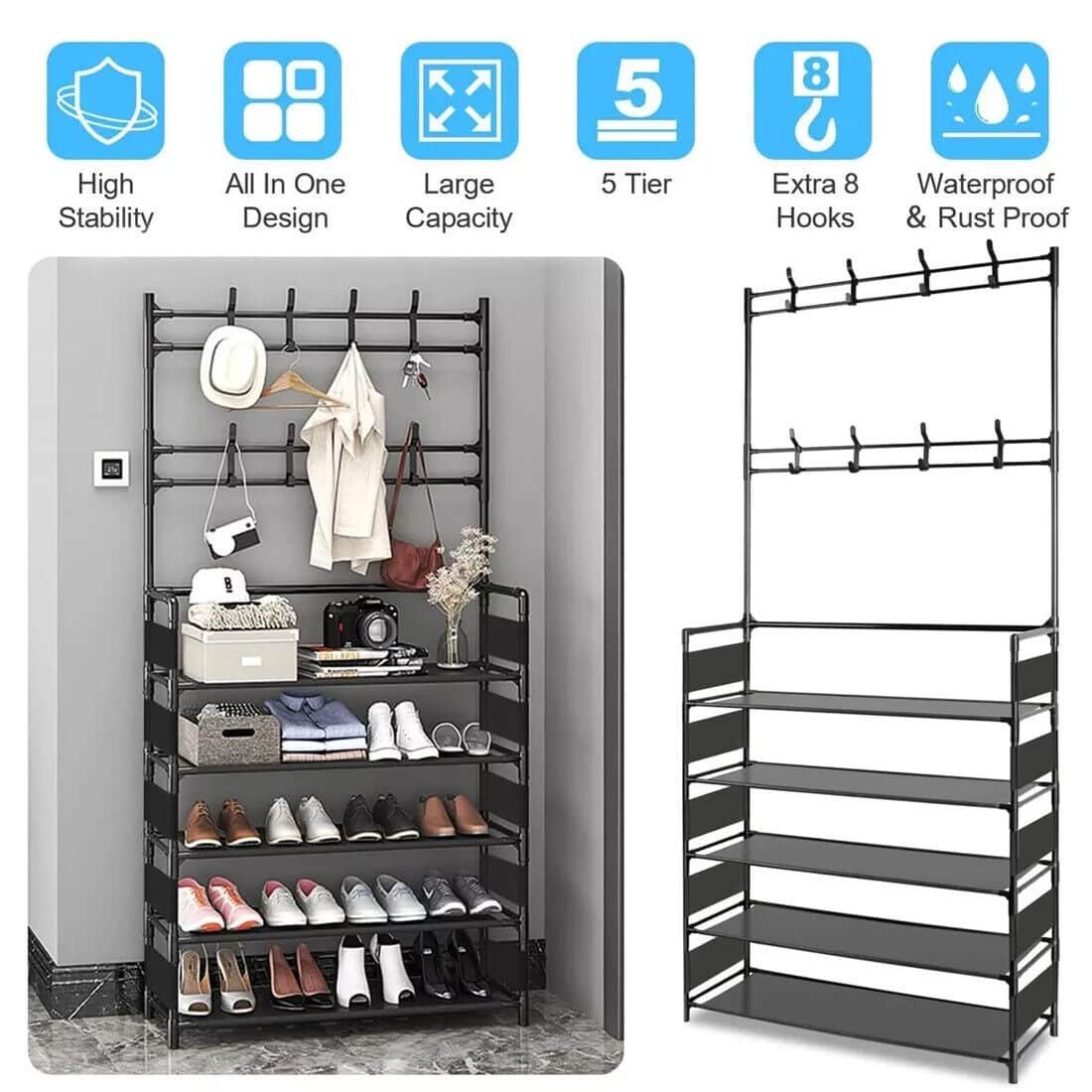 New Coat And Hat Stand 8 Hooks Metal Shoe Rack 5 Tiers Shelf Hanger Black UK - Image 5