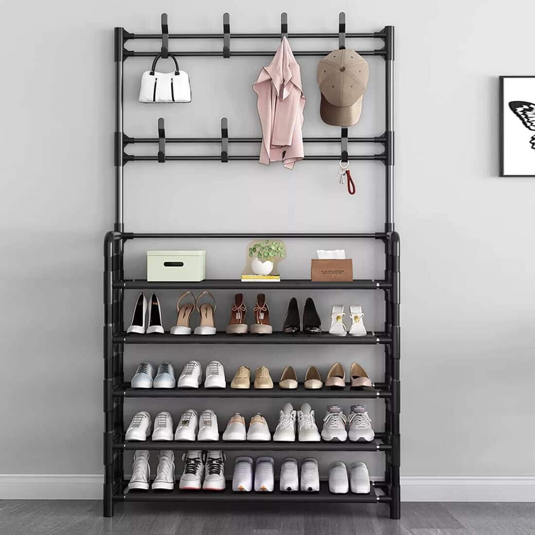 New Coat and Hat Stand 8 Hooks Metal Shoe Rack 5 Tiers Shelf Hanger Black UK
